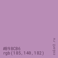 Цвет #B98CB6 в цветовой модели RGB обозначается тремя октетами (185, 140, 182) в десятичном формате и #B98CB6 в шестнадцатиричном (hex) формате, которые являются интенсивностью красного 185 (hex B9), интенсивность зелёного 140 (hex 8C) и интенсивность синего 182 (hex B6).