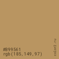 Цвет #B99561 в цветовой модели RGB обозначается тремя октетами (185, 149, 97) в десятичном формате и #B99561 в шестнадцатиричном (hex) формате, которые являются интенсивностью красного 185 (hex B9), интенсивность зелёного 149 (hex 95) и интенсивность синего 97 (hex 61).