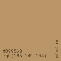 Цвет #B99568 в цветовой модели RGB обозначается тремя октетами (185, 149, 104) в десятичном формате и #B99568 в шестнадцатиричном (hex) формате, которые являются интенсивностью красного 185 (hex B9), интенсивность зелёного 149 (hex 95) и интенсивность синего 104 (hex 68).