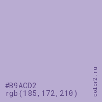 Цвет #B9ACD2 в цветовой модели RGB обозначается тремя октетами (185, 172, 210) в десятичном формате и #B9ACD2 в шестнадцатиричном (hex) формате, которые являются интенсивностью красного 185 (hex B9), интенсивность зелёного 172 (hex AC) и интенсивность синего 210 (hex D2).