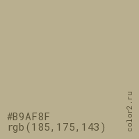 Цвет #B9AF8F в цветовой модели RGB обозначается тремя октетами (185, 175, 143) в десятичном формате и #B9AF8F в шестнадцатиричном (hex) формате, которые являются интенсивностью красного 185 (hex B9), интенсивность зелёного 175 (hex AF) и интенсивность синего 143 (hex 8F).