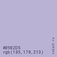 Цвет #B9B2D5 в цветовой модели RGB обозначается тремя октетами (185, 178, 213) в десятичном формате и #B9B2D5 в шестнадцатиричном (hex) формате, которые являются интенсивностью красного 185 (hex B9), интенсивность зелёного 178 (hex B2) и интенсивность синего 213 (hex D5).