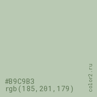 Цвет #B9C9B3 в цветовой модели RGB обозначается тремя октетами (185, 201, 179) в десятичном формате и #B9C9B3 в шестнадцатиричном (hex) формате, которые являются интенсивностью красного 185 (hex B9), интенсивность зелёного 201 (hex C9) и интенсивность синего 179 (hex B3).