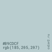 Цвет #B9CDCF в цветовой модели RGB обозначается тремя октетами (185, 205, 207) в десятичном формате и #B9CDCF в шестнадцатиричном (hex) формате, которые являются интенсивностью красного 185 (hex B9), интенсивность зелёного 205 (hex CD) и интенсивность синего 207 (hex CF).