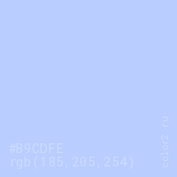 Цвет #B9CDFE в цветовой модели RGB обозначается тремя октетами (185, 205, 254) в десятичном формате и #B9CDFE в шестнадцатиричном (hex) формате, которые являются интенсивностью красного 185 (hex B9), интенсивность зелёного 205 (hex CD) и интенсивность синего 254 (hex FE).