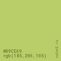 Цвет #B9CE69 в цветовой модели RGB обозначается тремя октетами (185, 206, 105) в десятичном формате и #B9CE69 в шестнадцатиричном (hex) формате, которые являются интенсивностью красного 185 (hex B9), интенсивность зелёного 206 (hex CE) и интенсивность синего 105 (hex 69).