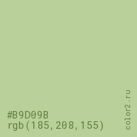 Цвет #B9D09B в цветовой модели RGB обозначается тремя октетами (185, 208, 155) в десятичном формате и #B9D09B в шестнадцатиричном (hex) формате, которые являются интенсивностью красного 185 (hex B9), интенсивность зелёного 208 (hex D0) и интенсивность синего 155 (hex 9B).
