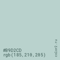 Цвет #B9D2CD в цветовой модели RGB обозначается тремя октетами (185, 210, 205) в десятичном формате и #B9D2CD в шестнадцатиричном (hex) формате, которые являются интенсивностью красного 185 (hex B9), интенсивность зелёного 210 (hex D2) и интенсивность синего 205 (hex CD).