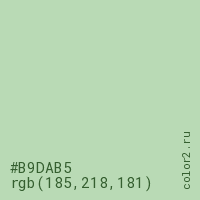 Цвет #B9DAB5 в цветовой модели RGB обозначается тремя октетами (185, 218, 181) в десятичном формате и #B9DAB5 в шестнадцатиричном (hex) формате, которые являются интенсивностью красного 185 (hex B9), интенсивность зелёного 218 (hex DA) и интенсивность синего 181 (hex B5).