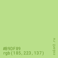 Цвет #B9DF89 в цветовой модели RGB обозначается тремя октетами (185, 223, 137) в десятичном формате и #B9DF89 в шестнадцатиричном (hex) формате, которые являются интенсивностью красного 185 (hex B9), интенсивность зелёного 223 (hex DF) и интенсивность синего 137 (hex 89).