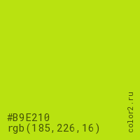 Цвет #B9E210 в цветовой модели RGB обозначается тремя октетами (185, 226, 16) в десятичном формате и #B9E210 в шестнадцатиричном (hex) формате, которые являются интенсивностью красного 185 (hex B9), интенсивность зелёного 226 (hex E2) и интенсивность синего 16 (hex 10).