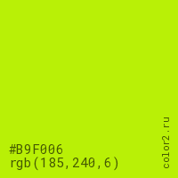 Цвет #B9F006 в цветовой модели RGB обозначается тремя октетами (185, 240, 6) в десятичном формате и #B9F006 в шестнадцатиричном (hex) формате, которые являются интенсивностью красного 185 (hex B9), интенсивность зелёного 240 (hex F0) и интенсивность синего 6 (hex 06).