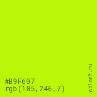 Цвет #B9F607 в цветовой модели RGB обозначается тремя октетами (185, 246, 7) в десятичном формате и #B9F607 в шестнадцатиричном (hex) формате, которые являются интенсивностью красного 185 (hex B9), интенсивность зелёного 246 (hex F6) и интенсивность синего 7 (hex 07).