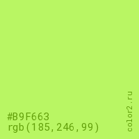 Цвет #B9F663 в цветовой модели RGB обозначается тремя октетами (185, 246, 99) в десятичном формате и #B9F663 в шестнадцатиричном (hex) формате, которые являются интенсивностью красного 185 (hex B9), интенсивность зелёного 246 (hex F6) и интенсивность синего 99 (hex 63).