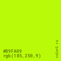 Цвет #B9FA09 в цветовой модели RGB обозначается тремя октетами (185, 250, 9) в десятичном формате и #B9FA09 в шестнадцатиричном (hex) формате, которые являются интенсивностью красного 185 (hex B9), интенсивность зелёного 250 (hex FA) и интенсивность синего 9 (hex 09).