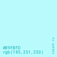 Цвет #B9FBFD в цветовой модели RGB обозначается тремя октетами (185, 251, 253) в десятичном формате и #B9FBFD в шестнадцатиричном (hex) формате, которые являются интенсивностью красного 185 (hex B9), интенсивность зелёного 251 (hex FB) и интенсивность синего 253 (hex FD).