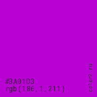 Цвет #BA01D3 в цветовой модели RGB обозначается тремя октетами (186, 1, 211) в десятичном формате и #BA01D3 в шестнадцатиричном (hex) формате, которые являются интенсивностью красного 186 (hex BA), интенсивность зелёного 1 (hex 01) и интенсивность синего 211 (hex D3).