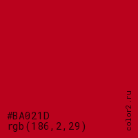Цвет #BA021D в цветовой модели RGB обозначается тремя октетами (186, 2, 29) в десятичном формате и #BA021D в шестнадцатиричном (hex) формате, которые являются интенсивностью красного 186 (hex BA), интенсивность зелёного 2 (hex 02) и интенсивность синего 29 (hex 1D).