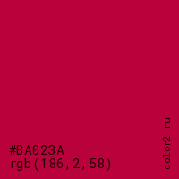 Цвет #BA023A в цветовой модели RGB обозначается тремя октетами (186, 2, 58) в десятичном формате и #BA023A в шестнадцатиричном (hex) формате, которые являются интенсивностью красного 186 (hex BA), интенсивность зелёного 2 (hex 02) и интенсивность синего 58 (hex 3A).