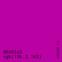 Цвет #BA02A3 в цветовой модели RGB обозначается тремя октетами (186, 2, 163) в десятичном формате и #BA02A3 в шестнадцатиричном (hex) формате, которые являются интенсивностью красного 186 (hex BA), интенсивность зелёного 2 (hex 02) и интенсивность синего 163 (hex A3).