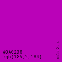 Цвет #BA02B8 в цветовой модели RGB обозначается тремя октетами (186, 2, 184) в десятичном формате и #BA02B8 в шестнадцатиричном (hex) формате, которые являются интенсивностью красного 186 (hex BA), интенсивность зелёного 2 (hex 02) и интенсивность синего 184 (hex B8).