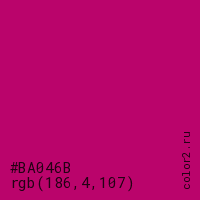 Цвет #BA046B в цветовой модели RGB обозначается тремя октетами (186, 4, 107) в десятичном формате и #BA046B в шестнадцатиричном (hex) формате, которые являются интенсивностью красного 186 (hex BA), интенсивность зелёного 4 (hex 04) и интенсивность синего 107 (hex 6B).