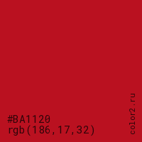 Цвет #BA1120 в цветовой модели RGB обозначается тремя октетами (186, 17, 32) в десятичном формате и #BA1120 в шестнадцатиричном (hex) формате, которые являются интенсивностью красного 186 (hex BA), интенсивность зелёного 17 (hex 11) и интенсивность синего 32 (hex 20).