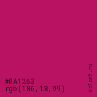 Цвет #BA1263 в цветовой модели RGB обозначается тремя октетами (186, 18, 99) в десятичном формате и #BA1263 в шестнадцатиричном (hex) формате, которые являются интенсивностью красного 186 (hex BA), интенсивность зелёного 18 (hex 12) и интенсивность синего 99 (hex 63).