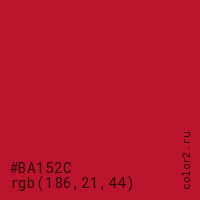 Цвет #BA152C в цветовой модели RGB обозначается тремя октетами (186, 21, 44) в десятичном формате и #BA152C в шестнадцатиричном (hex) формате, которые являются интенсивностью красного 186 (hex BA), интенсивность зелёного 21 (hex 15) и интенсивность синего 44 (hex 2C).