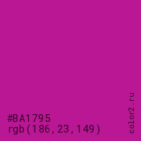 Цвет #BA1795 в цветовой модели RGB обозначается тремя октетами (186, 23, 149) в десятичном формате и #BA1795 в шестнадцатиричном (hex) формате, которые являются интенсивностью красного 186 (hex BA), интенсивность зелёного 23 (hex 17) и интенсивность синего 149 (hex 95).