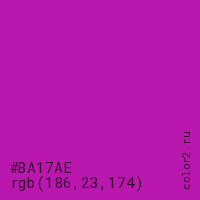 Цвет #BA17AE в цветовой модели RGB обозначается тремя октетами (186, 23, 174) в десятичном формате и #BA17AE в шестнадцатиричном (hex) формате, которые являются интенсивностью красного 186 (hex BA), интенсивность зелёного 23 (hex 17) и интенсивность синего 174 (hex AE).