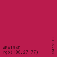 Цвет #BA1B4D в цветовой модели RGB обозначается тремя октетами (186, 27, 77) в десятичном формате и #BA1B4D в шестнадцатиричном (hex) формате, которые являются интенсивностью красного 186 (hex BA), интенсивность зелёного 27 (hex 1B) и интенсивность синего 77 (hex 4D).