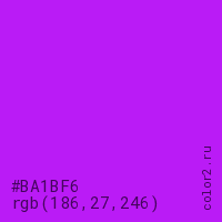 Цвет #BA1BF6 в цветовой модели RGB обозначается тремя октетами (186, 27, 246) в десятичном формате и #BA1BF6 в шестнадцатиричном (hex) формате, которые являются интенсивностью красного 186 (hex BA), интенсивность зелёного 27 (hex 1B) и интенсивность синего 246 (hex F6).