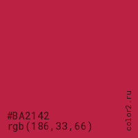 Цвет #BA2142 в цветовой модели RGB обозначается тремя октетами (186, 33, 66) в десятичном формате и #BA2142 в шестнадцатиричном (hex) формате, которые являются интенсивностью красного 186 (hex BA), интенсивность зелёного 33 (hex 21) и интенсивность синего 66 (hex 42).