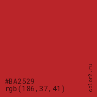 Цвет #BA2529 в цветовой модели RGB обозначается тремя октетами (186, 37, 41) в десятичном формате и #BA2529 в шестнадцатиричном (hex) формате, которые являются интенсивностью красного 186 (hex BA), интенсивность зелёного 37 (hex 25) и интенсивность синего 41 (hex 29).