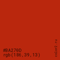 Цвет #BA270D в цветовой модели RGB обозначается тремя октетами (186, 39, 13) в десятичном формате и #BA270D в шестнадцатиричном (hex) формате, которые являются интенсивностью красного 186 (hex BA), интенсивность зелёного 39 (hex 27) и интенсивность синего 13 (hex 0D).