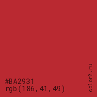 Цвет #BA2931 в цветовой модели RGB обозначается тремя октетами (186, 41, 49) в десятичном формате и #BA2931 в шестнадцатиричном (hex) формате, которые являются интенсивностью красного 186 (hex BA), интенсивность зелёного 41 (hex 29) и интенсивность синего 49 (hex 31).