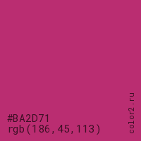 Цвет #BA2D71 в цветовой модели RGB обозначается тремя октетами (186, 45, 113) в десятичном формате и #BA2D71 в шестнадцатиричном (hex) формате, которые являются интенсивностью красного 186 (hex BA), интенсивность зелёного 45 (hex 2D) и интенсивность синего 113 (hex 71).