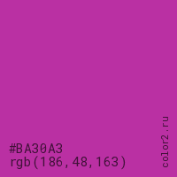 Цвет #BA30A3 в цветовой модели RGB обозначается тремя октетами (186, 48, 163) в десятичном формате и #BA30A3 в шестнадцатиричном (hex) формате, которые являются интенсивностью красного 186 (hex BA), интенсивность зелёного 48 (hex 30) и интенсивность синего 163 (hex A3).