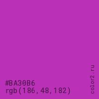 Цвет #BA30B6 в цветовой модели RGB обозначается тремя октетами (186, 48, 182) в десятичном формате и #BA30B6 в шестнадцатиричном (hex) формате, которые являются интенсивностью красного 186 (hex BA), интенсивность зелёного 48 (hex 30) и интенсивность синего 182 (hex B6).