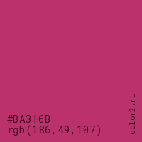 Цвет #BA316B в цветовой модели RGB обозначается тремя октетами (186, 49, 107) в десятичном формате и #BA316B в шестнадцатиричном (hex) формате, которые являются интенсивностью красного 186 (hex BA), интенсивность зелёного 49 (hex 31) и интенсивность синего 107 (hex 6B).