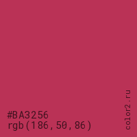 Цвет #BA3256 в цветовой модели RGB обозначается тремя октетами (186, 50, 86) в десятичном формате и #BA3256 в шестнадцатиричном (hex) формате, которые являются интенсивностью красного 186 (hex BA), интенсивность зелёного 50 (hex 32) и интенсивность синего 86 (hex 56).