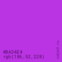 Цвет #BA34E4 в цветовой модели RGB обозначается тремя октетами (186, 52, 228) в десятичном формате и #BA34E4 в шестнадцатиричном (hex) формате, которые являются интенсивностью красного 186 (hex BA), интенсивность зелёного 52 (hex 34) и интенсивность синего 228 (hex E4).