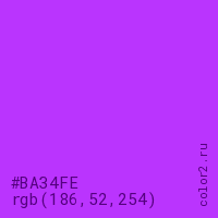 Цвет #BA34FE в цветовой модели RGB обозначается тремя октетами (186, 52, 254) в десятичном формате и #BA34FE в шестнадцатиричном (hex) формате, которые являются интенсивностью красного 186 (hex BA), интенсивность зелёного 52 (hex 34) и интенсивность синего 254 (hex FE).