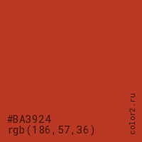 Цвет #BA3924 в цветовой модели RGB обозначается тремя октетами (186, 57, 36) в десятичном формате и #BA3924 в шестнадцатиричном (hex) формате, которые являются интенсивностью красного 186 (hex BA), интенсивность зелёного 57 (hex 39) и интенсивность синего 36 (hex 24).
