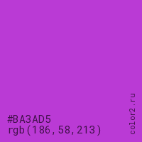 Цвет #BA3AD5 в цветовой модели RGB обозначается тремя октетами (186, 58, 213) в десятичном формате и #BA3AD5 в шестнадцатиричном (hex) формате, которые являются интенсивностью красного 186 (hex BA), интенсивность зелёного 58 (hex 3A) и интенсивность синего 213 (hex D5).