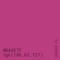 Цвет #BA3E7F в цветовой модели RGB обозначается тремя октетами (186, 62, 127) в десятичном формате и #BA3E7F в шестнадцатиричном (hex) формате, которые являются интенсивностью красного 186 (hex BA), интенсивность зелёного 62 (hex 3E) и интенсивность синего 127 (hex 7F).