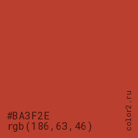 Цвет #BA3F2E в цветовой модели RGB обозначается тремя октетами (186, 63, 46) в десятичном формате и #BA3F2E в шестнадцатиричном (hex) формате, которые являются интенсивностью красного 186 (hex BA), интенсивность зелёного 63 (hex 3F) и интенсивность синего 46 (hex 2E).