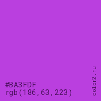 Цвет #BA3FDF в цветовой модели RGB обозначается тремя октетами (186, 63, 223) в десятичном формате и #BA3FDF в шестнадцатиричном (hex) формате, которые являются интенсивностью красного 186 (hex BA), интенсивность зелёного 63 (hex 3F) и интенсивность синего 223 (hex DF).