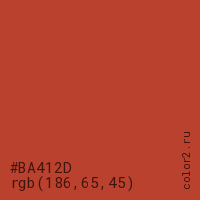 Цвет #BA412D в цветовой модели RGB обозначается тремя октетами (186, 65, 45) в десятичном формате и #BA412D в шестнадцатиричном (hex) формате, которые являются интенсивностью красного 186 (hex BA), интенсивность зелёного 65 (hex 41) и интенсивность синего 45 (hex 2D).